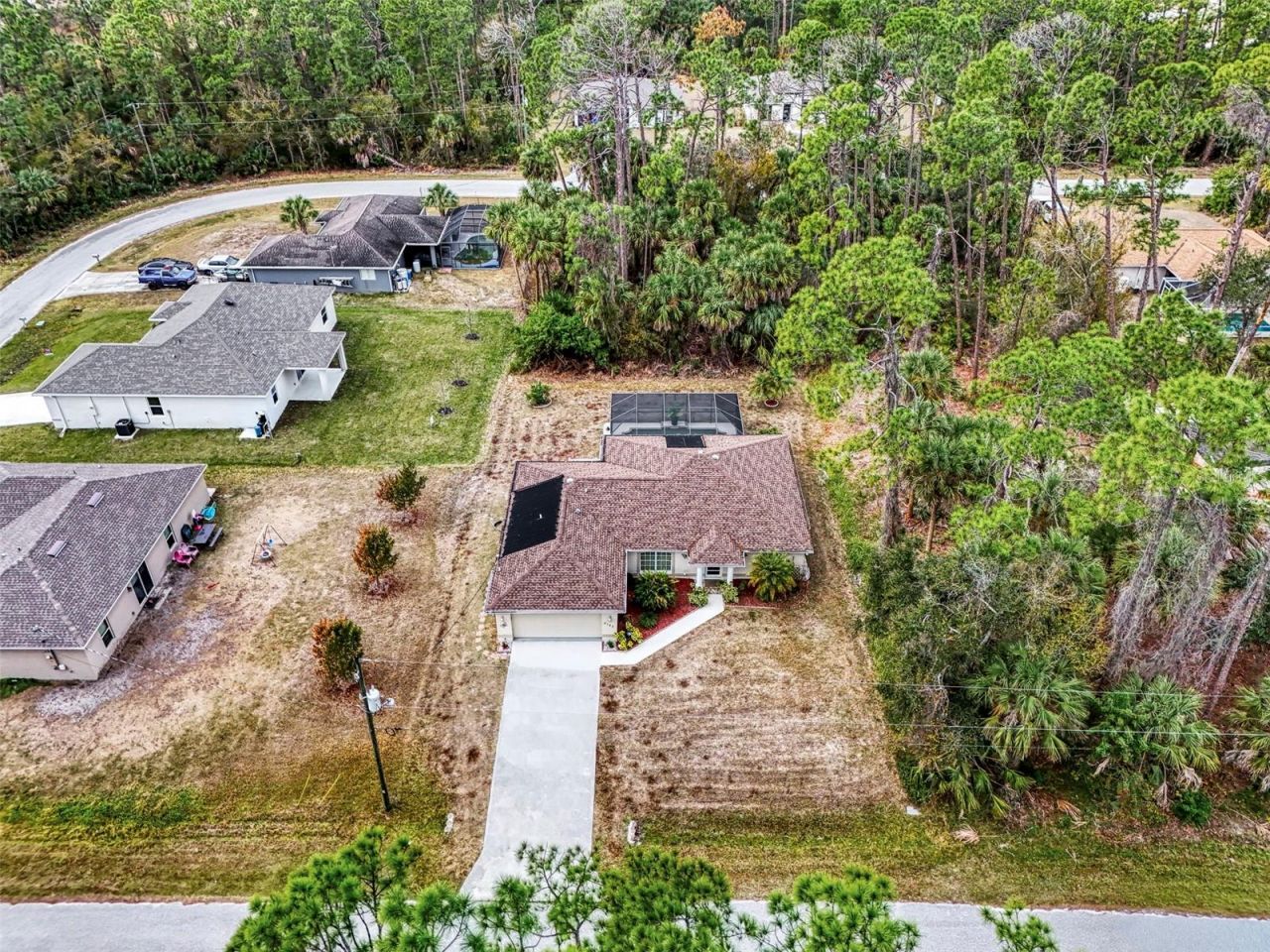 Attractive three bedroom, two bath, plus den, pool home, in a private, secluded North Port neighborhood. The home features an open floor plan, with cathedral ceilings in the main areas upon entrance. Your kitchen features stainless appliances, Corian counters, breakfast bar and a large closet pantry. The kitchen opens to your living room, dining room and den. French doors from the dining area, out to the lanai and solar heated pool. Private wooded views from your backyard. The master bedroom has a large walk-in closet. The den is a great extra room, with French Doors and could be used as an office or study too. The home is being sold turnkey furnished and has been taken care of immaculately by the owners and is move-in ready! The AC system and water heater were replaced in 2019, the roof was replaced in 2022. The pool has a newer pump and timer. Great location and within 5 miles to the interstate. Come see this great buy today!